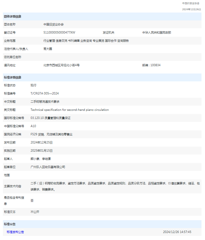 乐人回收乐器-中国旧货业协会《二手钢琴流通技术要求-团体标准》起草单位,引领行业规范化新时代